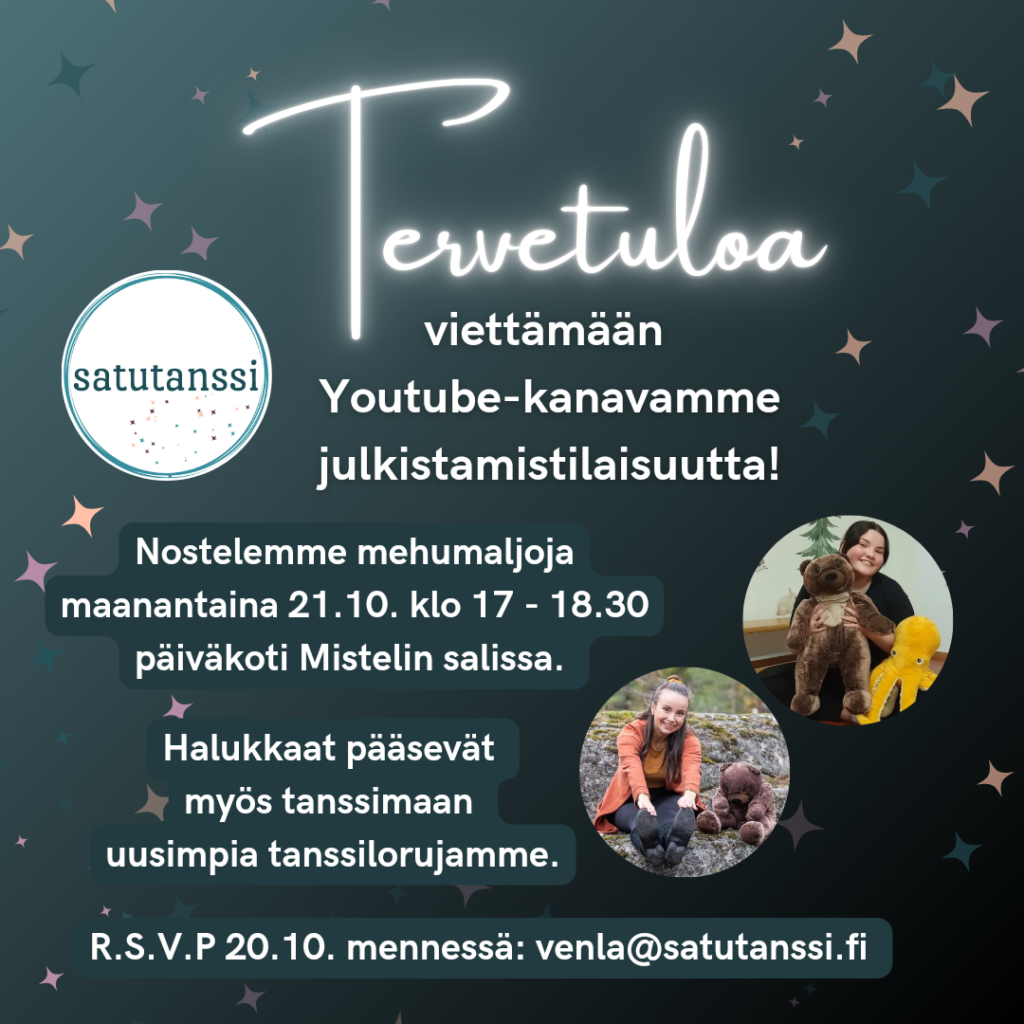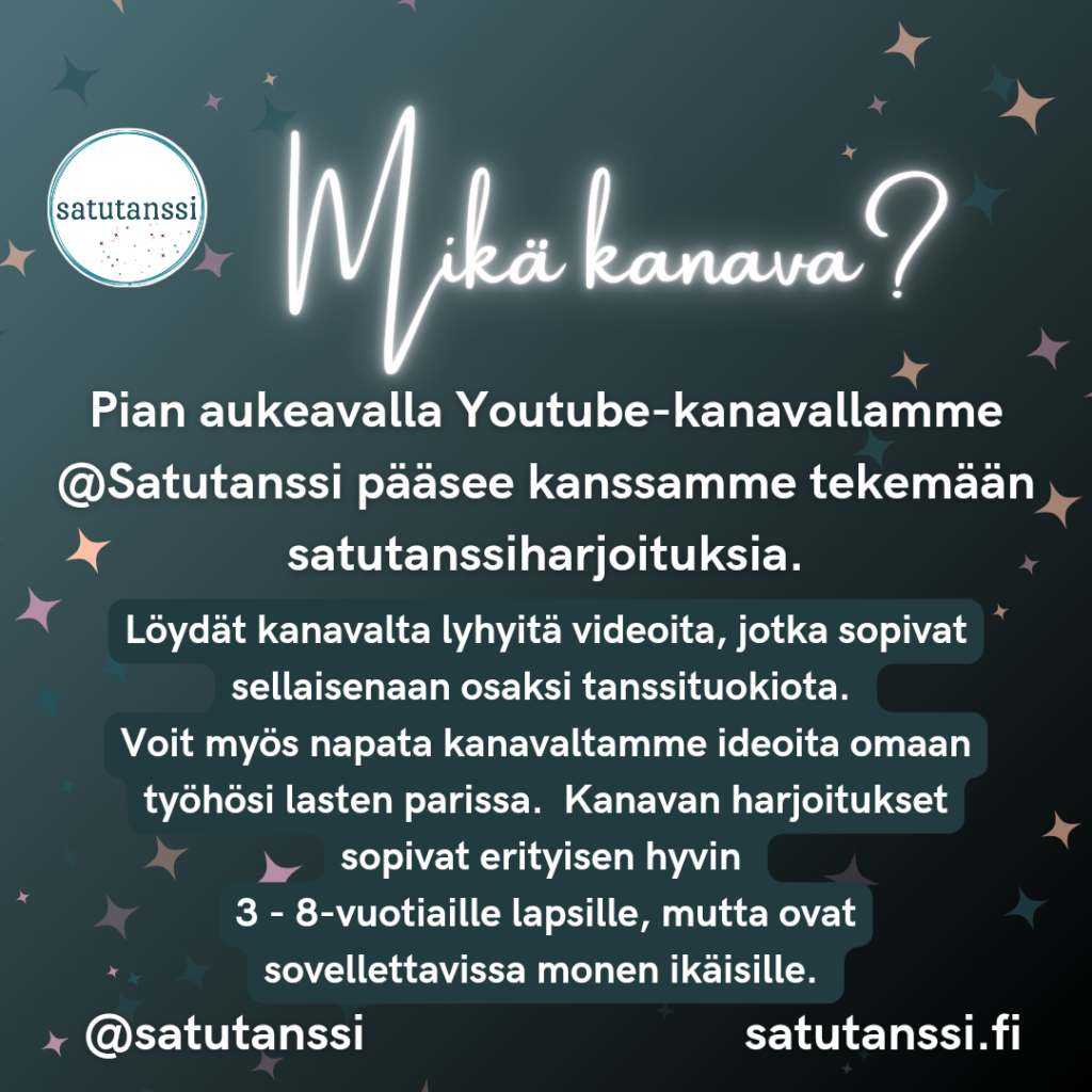 @Satutanssi YouTube-kanava aukeaa maanantaina 21.10. Löydät kanavalta lyhyitä ohjattuja satutanssiharjoituksia. Voit hyödyntää harjoituksia kotona perheesi kanssa tai työssäsi lasten parissa.